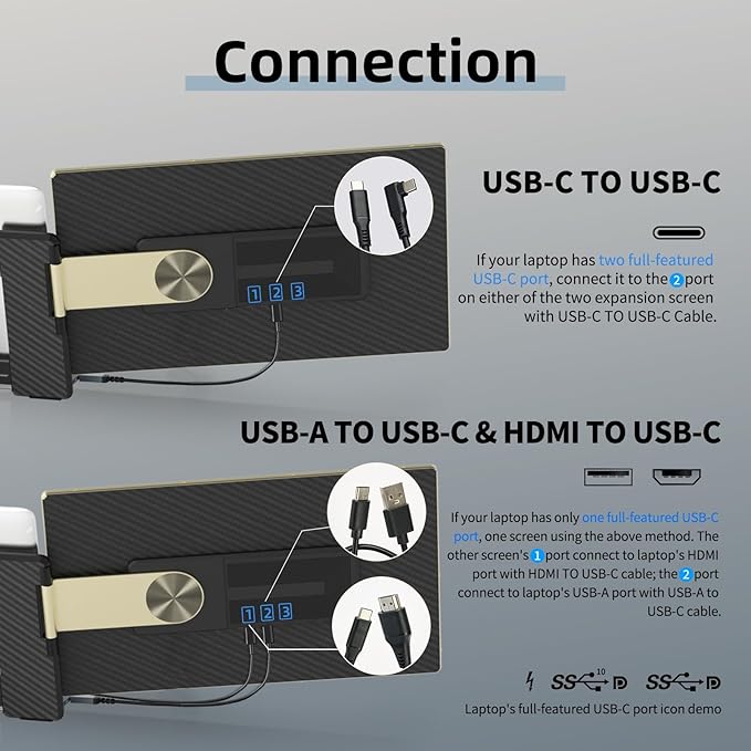 - Improve Efficiency & Magnetic Storage: The portable monitor supports both mirrored and extended modes, eliminating the need to constantly switch windows on a single laptop screen and allowing you to multitask across multiple displays, boosting work efficiency by up to 300%. Perfect choice for remote workers, IT professionals, stock traders. The magnetic storage design securely fastens the screen and parts together, preventing damage to the screen when carrying the screen extender on the go.